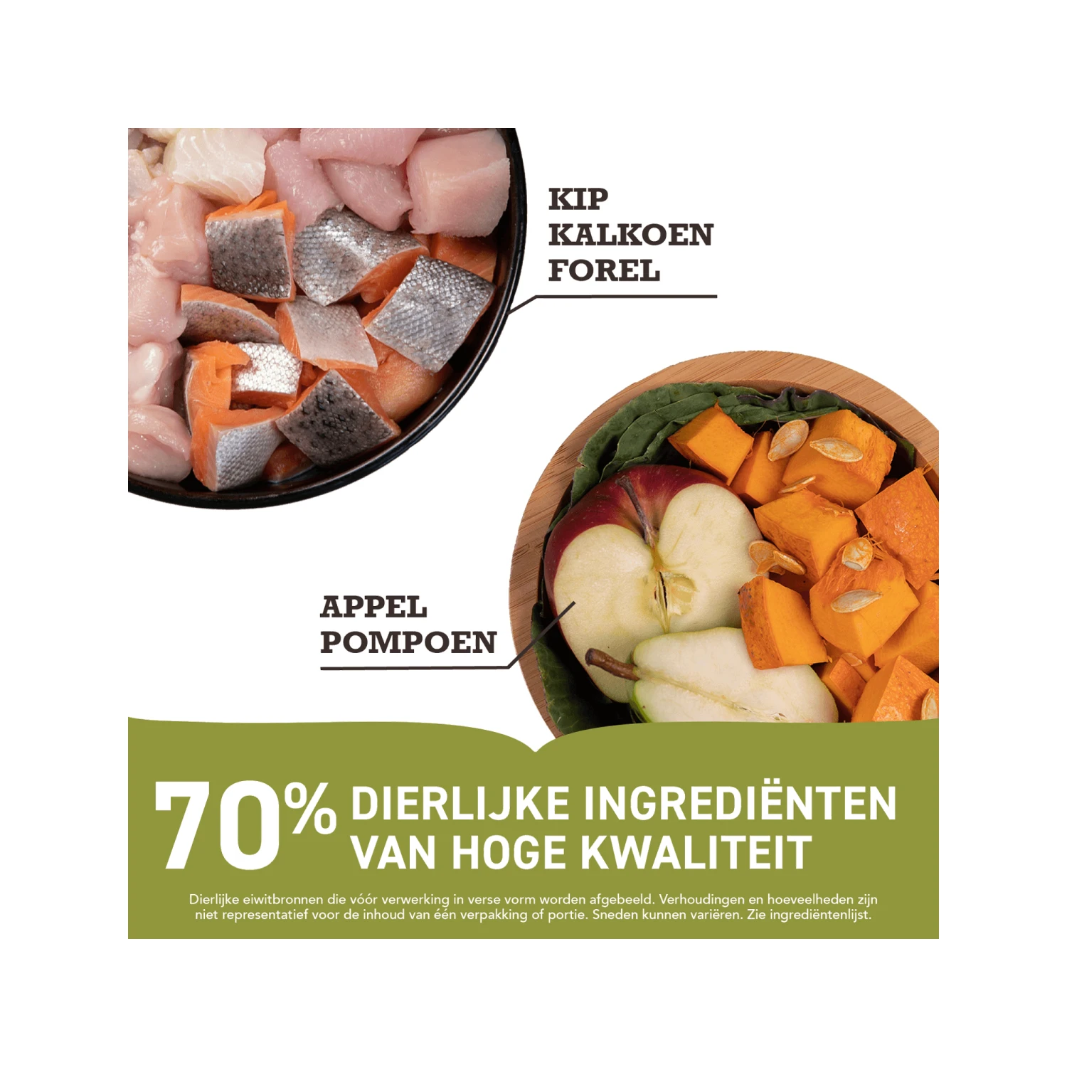 Vers kippenvlees (8%), vers kalkoenvlees (8%), verse kippenlever, -hart en -lever (8%), kippenmeel (8%), kalkoenmeel (8%), haringmeel (8%), groene erwten, rode linzen, hele kikkererwten, hele eieren (4%), wildgevangen snoekbaars, wildgevangen forel, kippenvet (4%), verse kalkoenlever, -hart en -lever (3%), groene linzen, pintobonen, gele erwten, zongedroogde alfalfa, alaskakoolvisolie (2%), linzenvezels, gedroogd kippenkraakbeen (1%), gedroogde bruine kelp, verse pompoen, verse pastinaak, verse groene boerenkool, verse spinazie, verse mosterd, verse raapstelen, verse wortelen, verse rode appels, verse peren, gevriesdroogde kippen- en kalkoenlever (0,1%), zout, verse cranberries, verse blueberries, cichoreiwortel, kurkumawortel, mariadistel, kliswortel, lavendel, heemstwortel en rozenbottel.