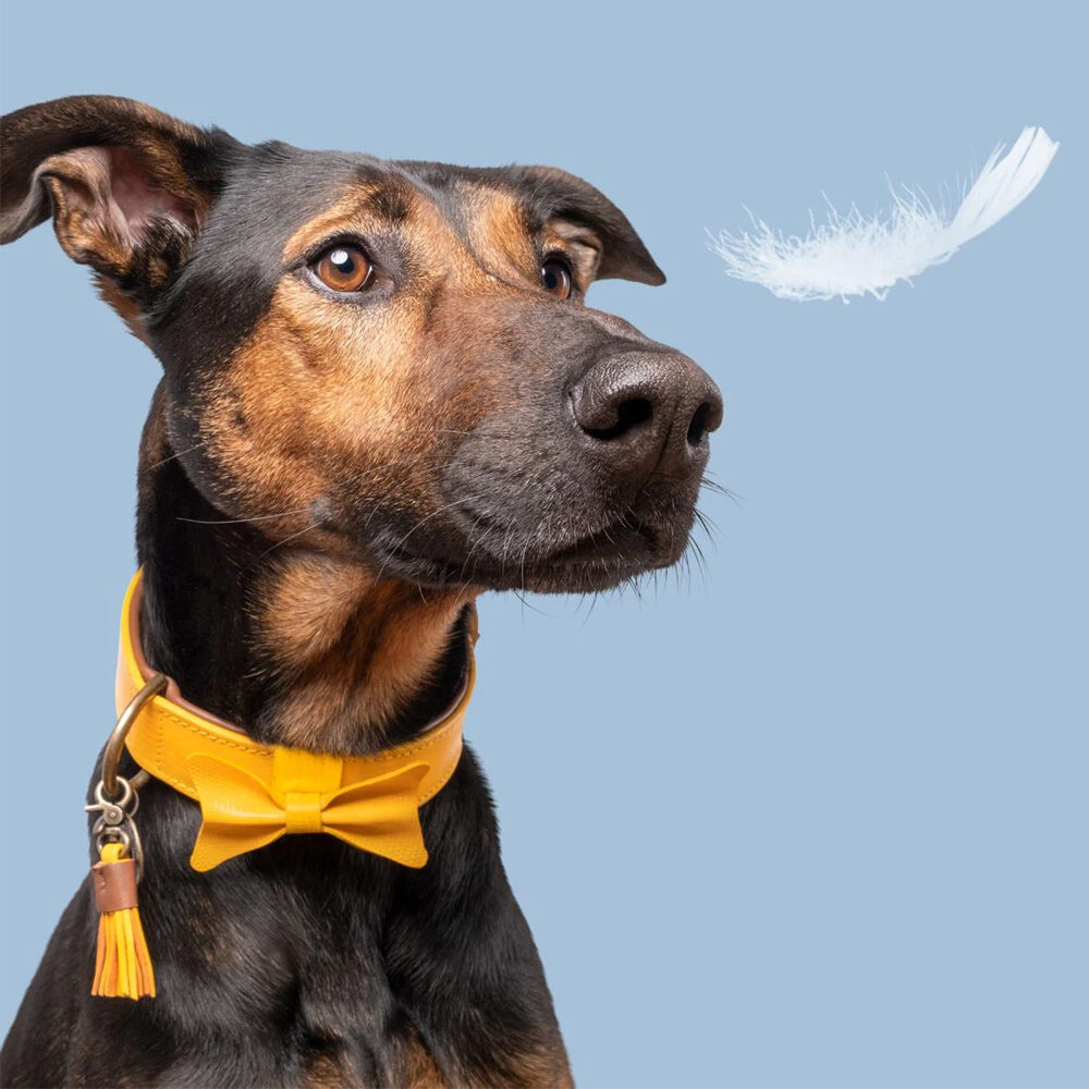 De gele Bibi halsband uit de City Collectie van DWAM is minimalistisch en luxueuze leren halsband voorzien van hagedissen print. Deze halsband doet het goed op feesten en partijen, maar zal ook een echte eye-catcher zijn in het park. Doordat de strik om de halsband los zit en gemakkelijk te verwijderen is, kunt u helemaal zelf de look van uw viervoeter bepalen. Luxe of casual? Het kan allemaal.