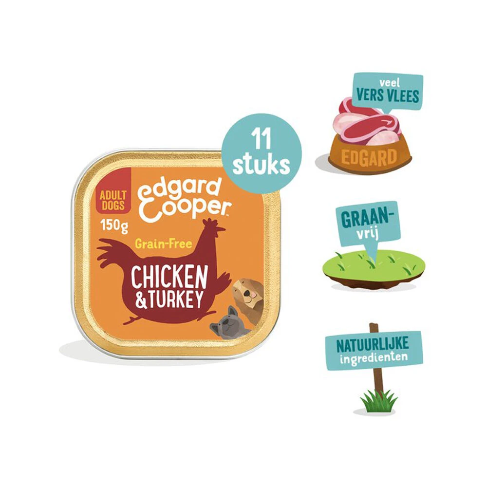 Edgard & Cooper Adult – Kip & Kalkoen – Kuipje is ook als smakelijke hondenbrok verkrijgbaar.