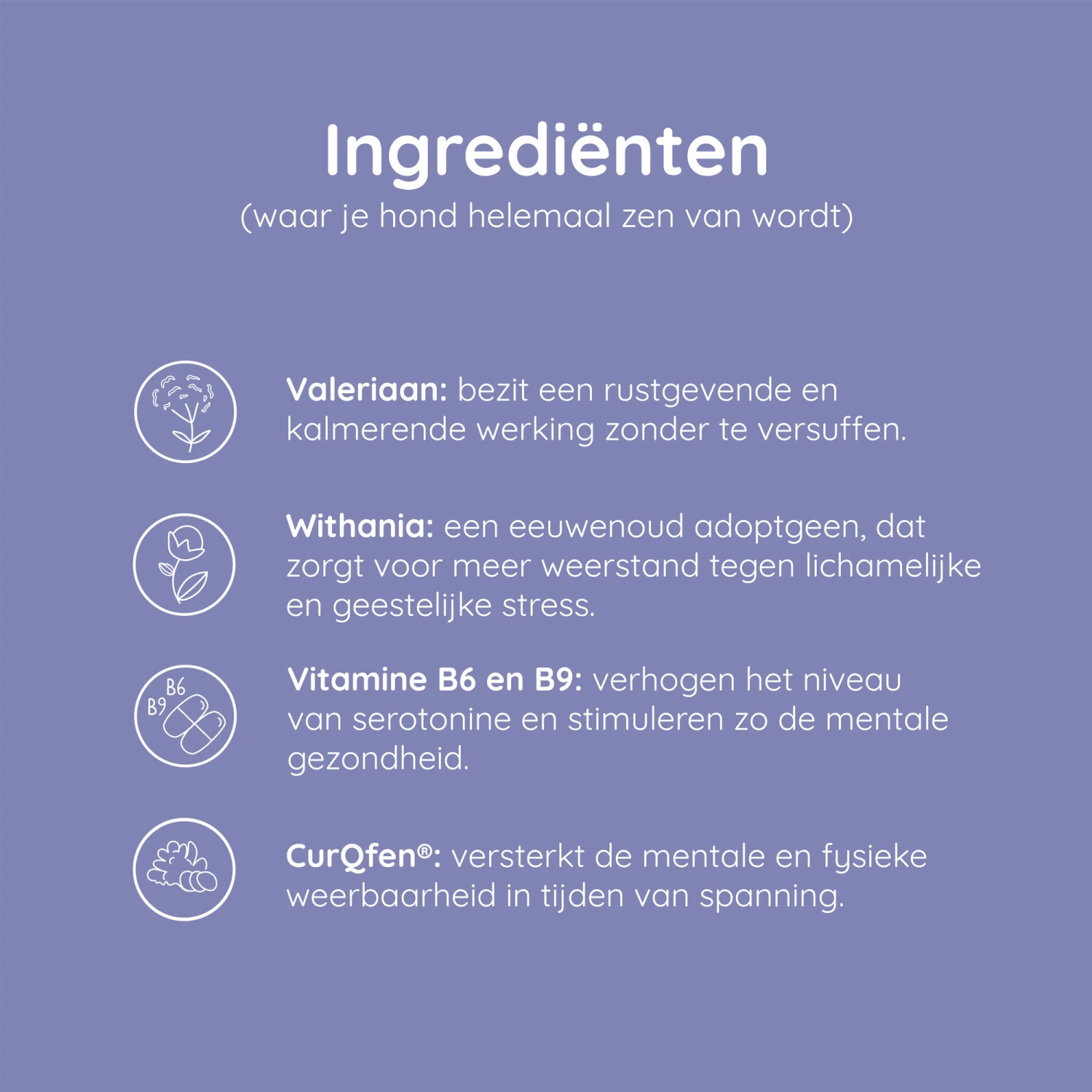 Withania (Ashwagandha) extract 240mg, Curcumine/Fenugriek complex (CurQfen®) 60 mg, valeriaan extract 10 mg (ratio 3-6/1 > 40mg), Vitamine B9 40 mcg, Vitamine B6 220 mcg, gelatine (capsule) 75 mg, magnesiumstearaat 6,85 mg. CurQfen® – patent Akay-group