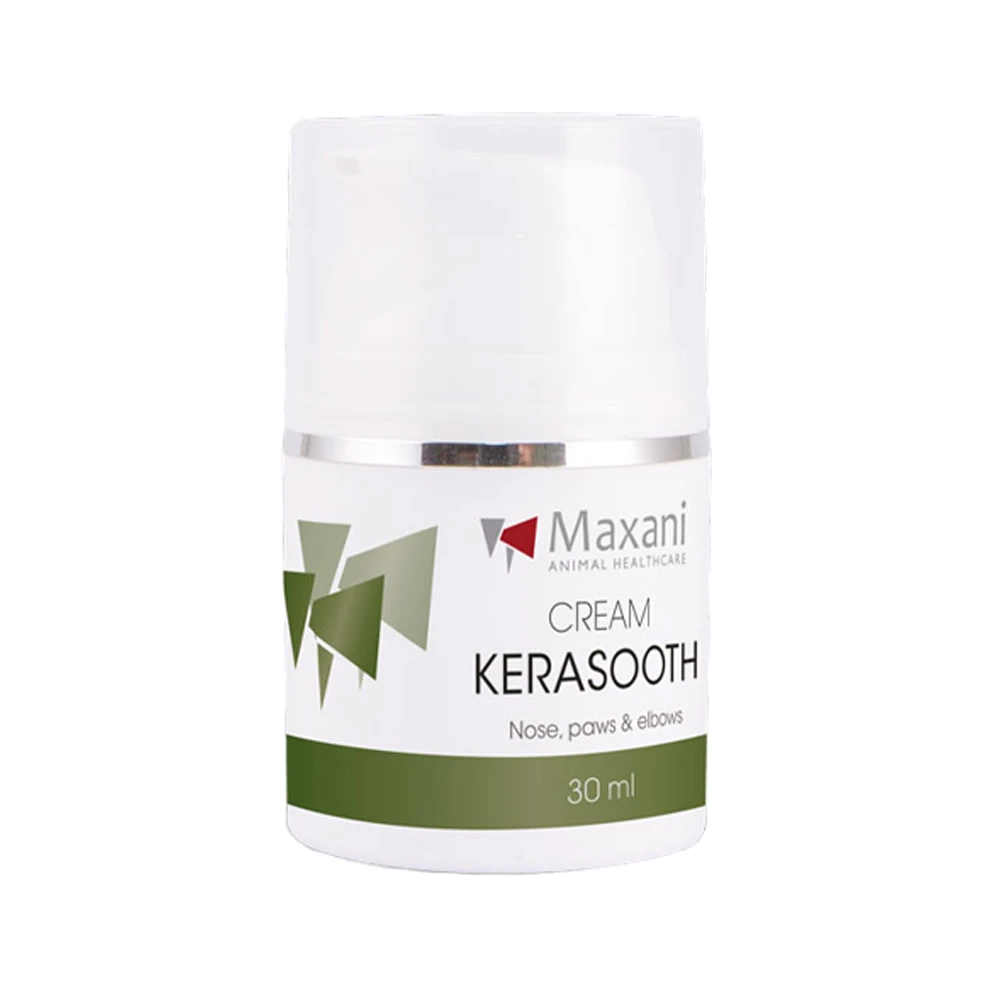 Heeft uw dier last van droge plekken of scheurtjes in de voetzoelen? Maxani KeraSooth crème verzacht de droge of ruwe voetzolen, neus en ellebogen.