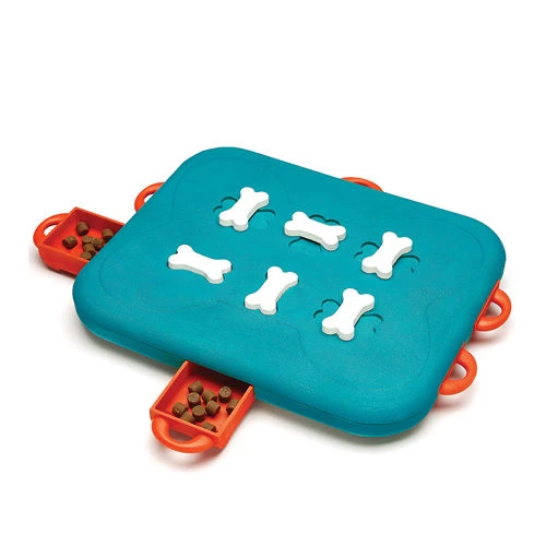 Laat uw huisdier eerst gaan zitten en laat hem toekijken hoe de lades van dit speeltje gevuld worden. De botjes moeten in de blokkerstand staan en daarna moet u de lades sluiten. Vervolgens moet u het teken geven aan uw huisdier om te beginnen. Om het eventueel moeilijker te maken, kunt u de botjes draaien waardoor ze de laatjes blokkeren. Hierdoor moet u huisdier de botjes draaien om bij de snack uit te komen. Daarna moet u uw huisdier aanleren dat het gevolg van deze actie kan leiden tot het openen van het laatje. Probeer uw huisdier aanwijzingen te geven en prijs elke voortgang in het spel enthousiast.