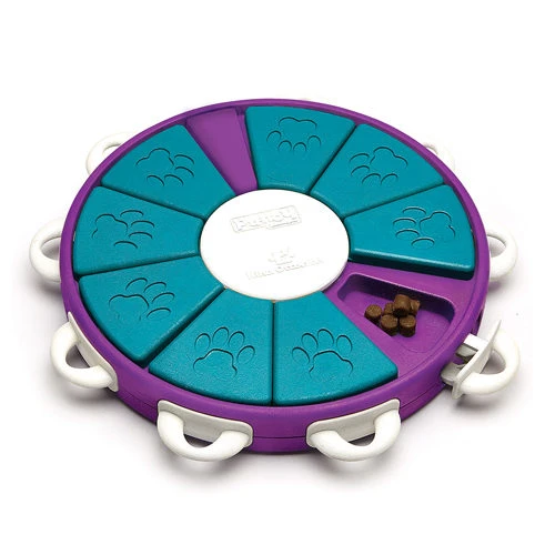 Laat uw huisdier eerst zitten en laat hem daarna zien hoe u de gaten onder de verschuifbare pizzapunten vult met snacks. Hierna kunt u de hond een teken geven dat hij mag beginnen. Om het uitdagender te maken kunt u de pizzapunten vastzetten met de witte handvaten aan de zijkant van het spel. Deze handvaten moet hij eerst met zijn poot of snuit induwen om het pizzapunt te deblokkeren. Daarna kan uw huisdier het pizzapunt verschuiven om bij de snack te komen. Probeert uw huisdier aanwijzingen te geven en prijs elke voortgang in het spel met enthousiasme.