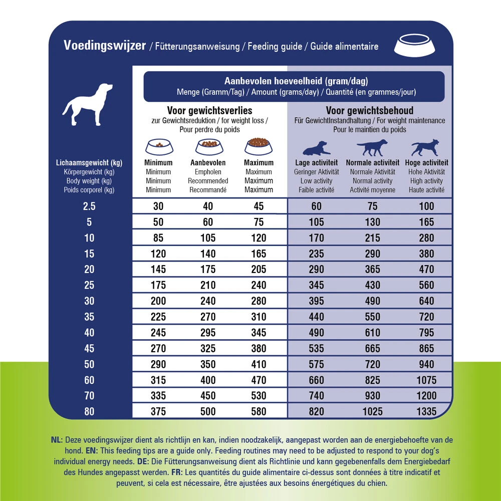 - Volwassen honden, tot een leeftijd van ongeveer 8 jaar, met overgewicht en/of diabetes mellitus (suikerziekte).