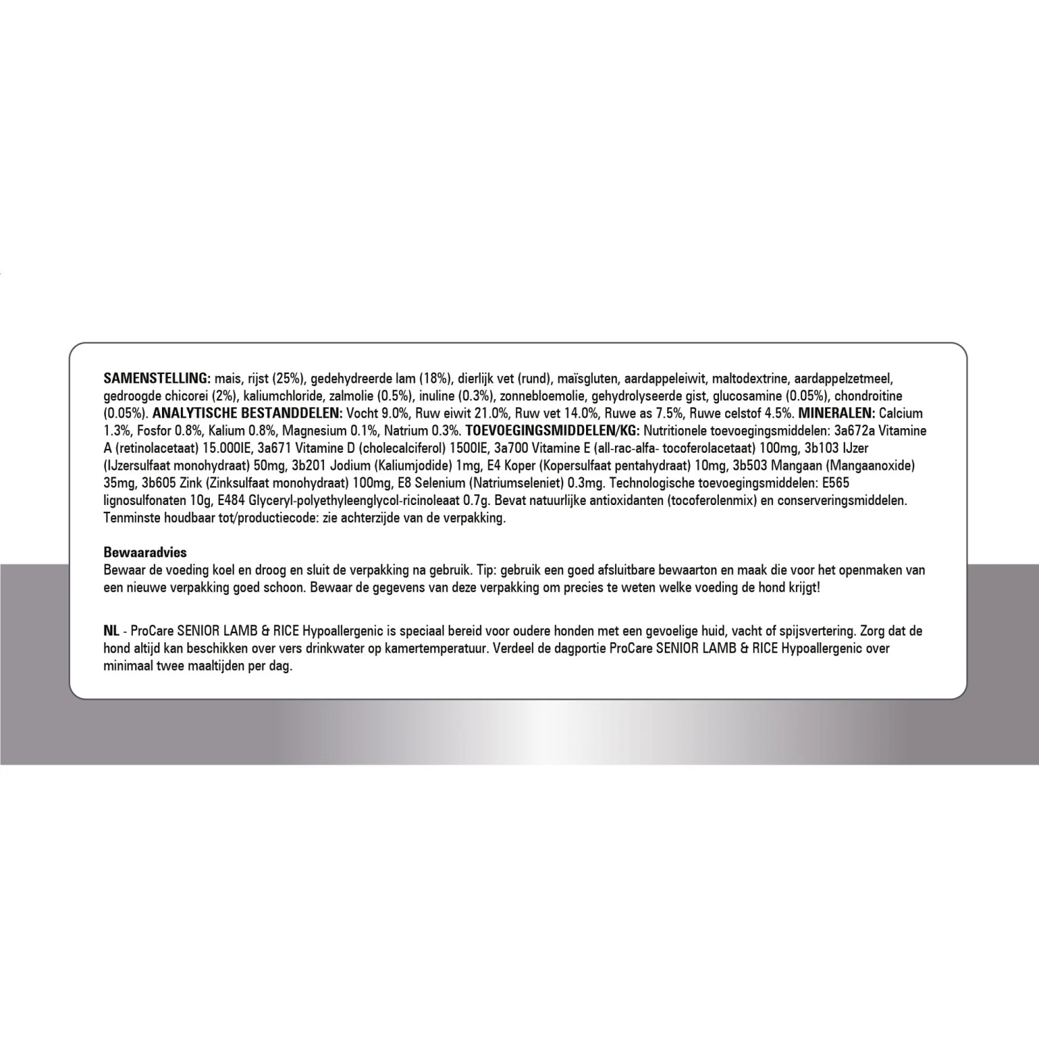 Prins ProCare Lamb & Rice Senior Hypoallergenic is een geperste voeding voor honden van 8 jaar en ouder met een gevoelige huid en vacht. De voeding is volledig hypoallergeen, waardoor u bijdraagt aan het verminderen op de overgevoeligheidsreactie door een voedselallergie. De voeding bevat lam als enige eiwitbron en is vrij van tarwegluten. De voeding kan ook gegeven worden aan honden met een voedselintolerantie. ProCare Lamb & Rice Senior Hypoallergenic van Prins is rijk aan vitaminen en mineralen, zoals vitamine D, zink en selenium om het immuunsysteem te ondersteunen. Daarnaast bevorderen ingrediënten zoals zalmolie, glucosamine en chondroïtine het ondersteunen van de gewrichten.