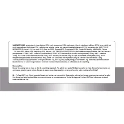 Gedehydreerde kip en kalkoen (26%), maïs, tarwevezels (8.5%), gedroogde cichorei, maisgluten, cellulose (6.5%), tarwe, dierlijk vet (rund), gevogelte eiwithydrolysaat (3%), maltodextrine, zalmolie, inuline, gist, gehydrolyseerde kippenlever (0.15%), zonnebloemolie.