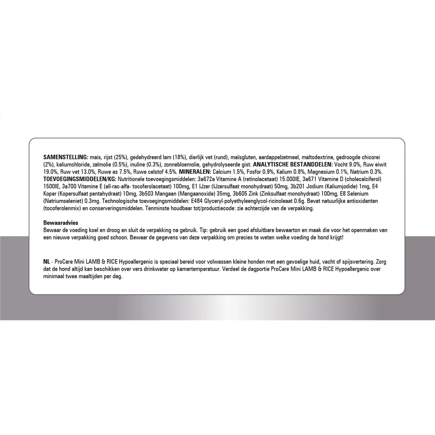 Honden die gevoelig op eten reageren, hebben een aangepaste voeding nodig. De ProCare mini Lamb & Rice Hypoallergenic van Prins is een hypoallergene voeding en vrij van tarwegluten. Deze voeding is speciaal samengesteld voor honden van een klein ras tot 8 jaar oud. Het voer bevat lamsmeel als enige eiwitbron, die bijdraagt op het verminderen van de kans op een overgevoeligheidsreactie. De zalmolie in het droogvoer ondersteunt een gezonde en glanzende vacht. Daarnaast is een goede darmflora erg belangrijk, de voedingsvezels, waaronder FOS, dragen bij aan een goede vertering en evenwichtige darmflora. Als laatst kan nog gezegd worden dat de voeding rijk is aan vitaminen en mineralen, waaronder vitamine D, zink en selenium die het immuunsysteem ondersteunen.
