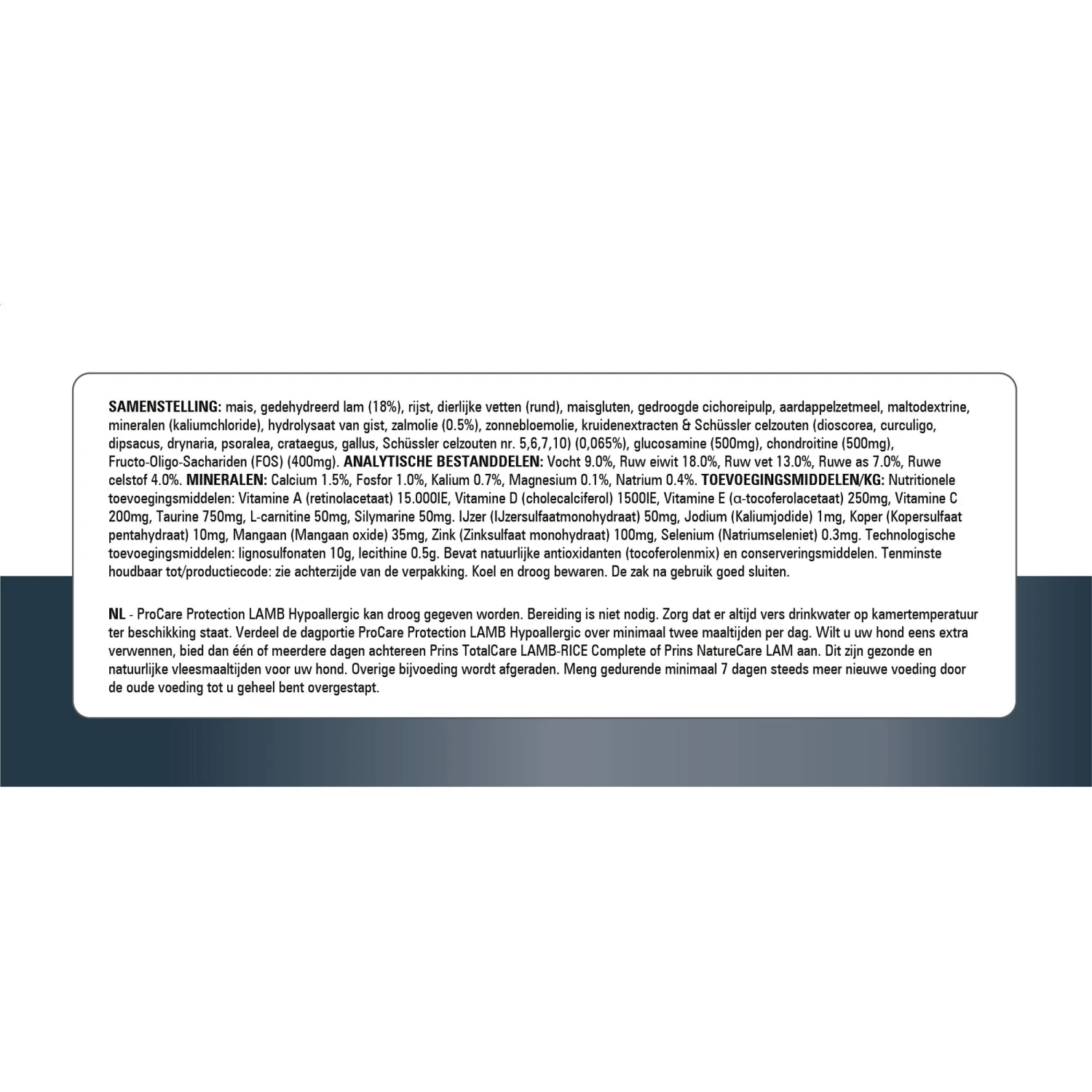 Maïs, gedehydreerd lam (18%), rijst, dierlijke vetten (rund), maisgluten, gedroogde cichoreipulp, aardappelzetmeel, maltodextrine, mineralen (kaliumchloride), hydrolysaat van gist, zalmolie (0.5%), zonnebloemolie, kruidenextracten & Schüssler celzouten (dioscorea, curculigo, dipsacus, drynaria, psoralea, crataegus, gallus, Schüssler celzouten nr. 5,6,7,10) (0,065%), glucosamine (500mg), chondroitine (500mg), Fructo-Oligo-Sachariden (FOS) (400mg).