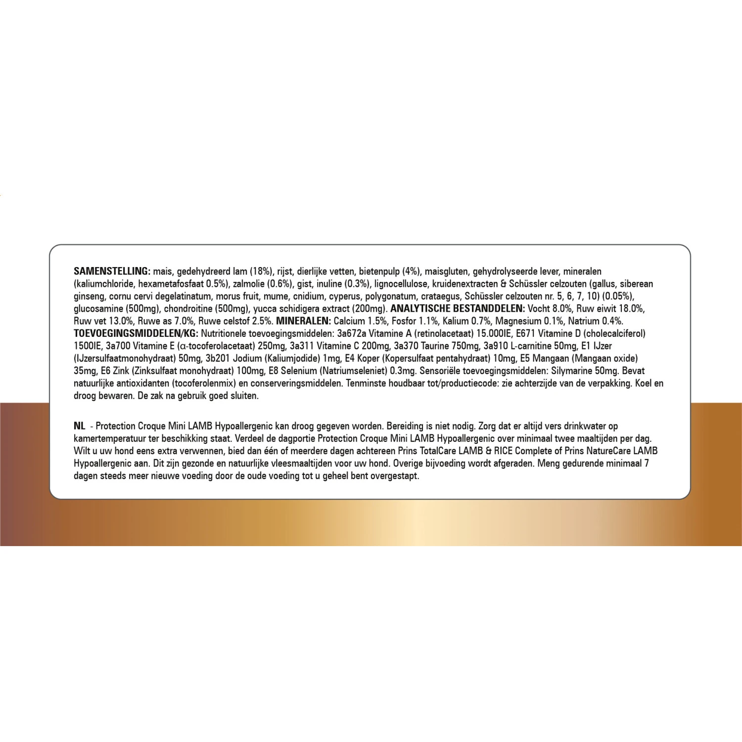 Mais, gedehydreerd lam (18%), rijst, dierlijke vetten, bietenpulp (4%), maisgluten, gehydrolyseerde lever, mineralen (kaliumchloride, hexametafosfaat 0.5%), zalmolie (0.6%), gist, inuline (0.3%), lignocellulose, kruidenextracten & Schüssler celzouten (gallus, siberean ginseng, cornu cervi degelatinatum, morus fruit, mume, cnidium, cyperus, polygonatum, crataegus, Schüssler celzouten nr. 5, 6, 7, 10) (0.05%), glucosamine (500mg), chondroitine (500mg), yucca schidigera extract (200mg), Bactillus Subtilis (100mg).