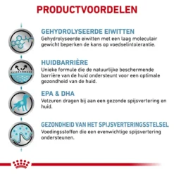 Royal Canin Hypoallergenic is een speciaal ontwikkelde dieetvoeding die helpt intoleranties en allergieën voor bepaalde voedingsstoffen of ingrediënten te verminderen. De voeding bevat waardevolle, gehydrolyseerde soja-eiwitten, welke zelden een overgevoeligheidsreactie bij uw hond uitlokken. Daarnaast zorgt de unieke samenstelling ervoor dat de huid gevoed wordt en dat de beschermende functie van de huid versterkt wordt. Bovendien dragen omega 3-vetzuren (EPA/DHA) bij aan een mooie, glanzende vacht. Er zijn specifieke, zeer goed verteerbare voedingsstoffen toegevoegd aan het voer, welke een optimale spijsvertering en een gunstige darmflora bevorderen. Tot slot helpt Royal Canin Hypoallergenic gezonde cellen en weefsel te beschermen en te behouden.