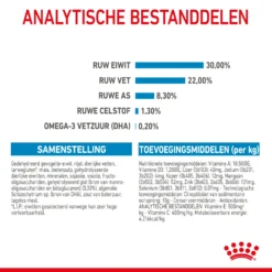 Gedehydreerde gevogelte-eiwitten, rijst, dierlijke vetten, tarwegluten*, maïs, bietenpulp, gehydrolyseerde dierlijke eiwitten, mineralen, sojaolie, visolie, fructo-oligosacchariden, gehydrolyseerd gist (bron van manno-oligosacchariden en bèta-glucanen) (0,30%), algenolie Schizochytrium sp. (bron van DHA), zout van boterzuur, tagetes meel.