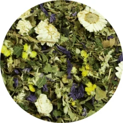 Berkenblad, restschaarwortel, brandnetelblad, paardenbloemkruid, peterselie, guldenroede kruid, paardenstaart, orthosiphon, kaasjeskruid, poesjes, Romeinse kamille, Bach bloesem essence (mosterd, beuk, cichorei, ster van Bethlehem, krabappel, wilde haver).