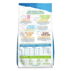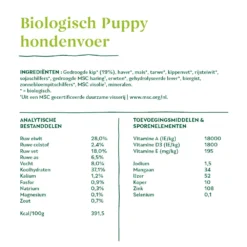Biologische gedroogde kip (22%), biologische volkoren haver, biologische gele mais, biologische volkoren tarwe, biologische kippenvet (bron van energie en essentiële vetzuren), biologische sojaschilfers (bron van vezels), gedroogde wilde haring (2%) (MSC¹) (bron van omega 3&6 en essentiële vetzuren), biologische erwten, biologische gehydrolyseerde lever, biologische zonnebloempitschilfers (bron van vezels), mineralen, biergist(bron van hoogwaardige eiwitten en essentiële aminozuren).
